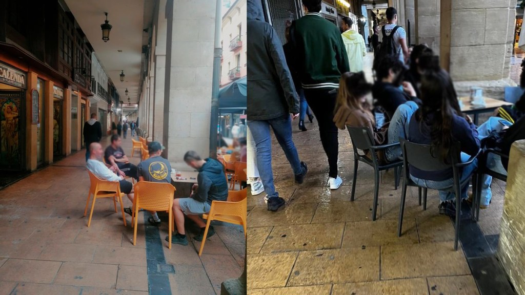 Las terrazas de veladores (mesas y sillas bajas) están prohibidas salvo en las zonas y establecimientos regulados (Plaza de San Agustín, Taberna de Correos, Los Rotos, La Concordia…)