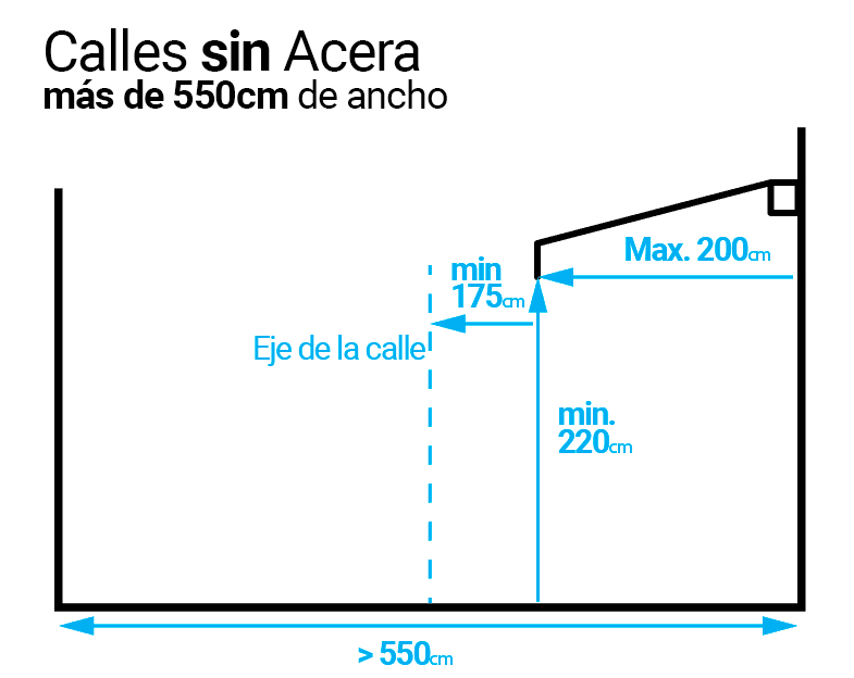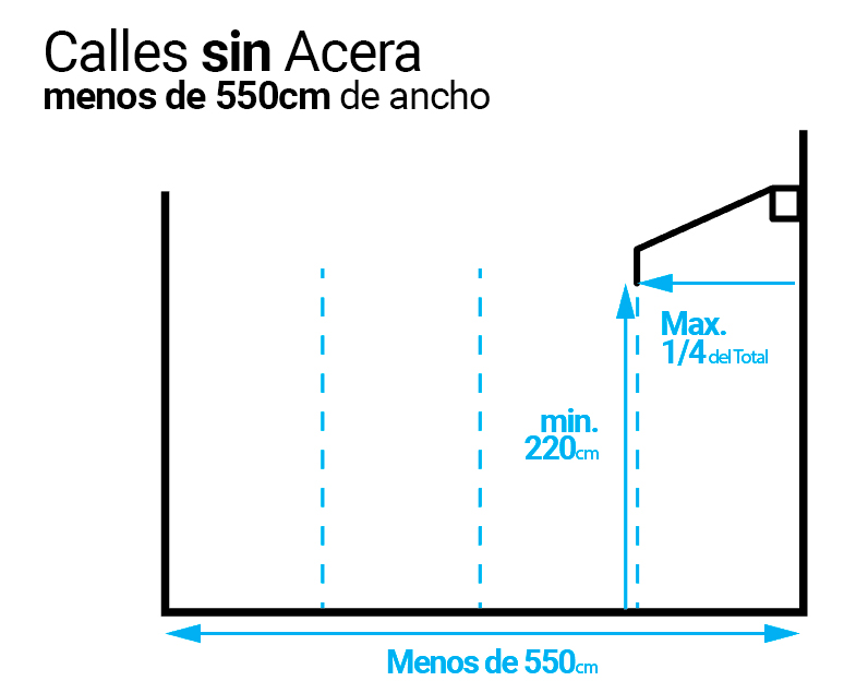 Cuando no exista acera, se permiten siempre que queden libres hasta el eje de la calle al menos 1’75 m. Su vuelo máximo será de 2’00 m.