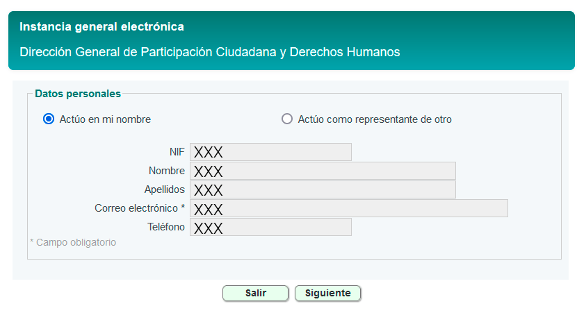 Como la presentamos a titulo personal dejamos esa opción activada, rellenamos los datos y pulsamos SIGUIENTE👇