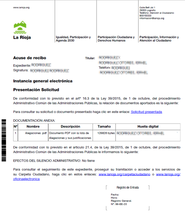Para un tramite con el Gobierno de La Rioja, como la presentación de alegaciones por la ampliación del horario nocturno, puedes hacerlo de forma presencia o telemática.