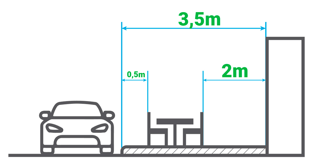 👽 Si la terraza esta en una acera estrecha (3,5-4m) la longitud de la terraza no debe superar la longitud de la fachada